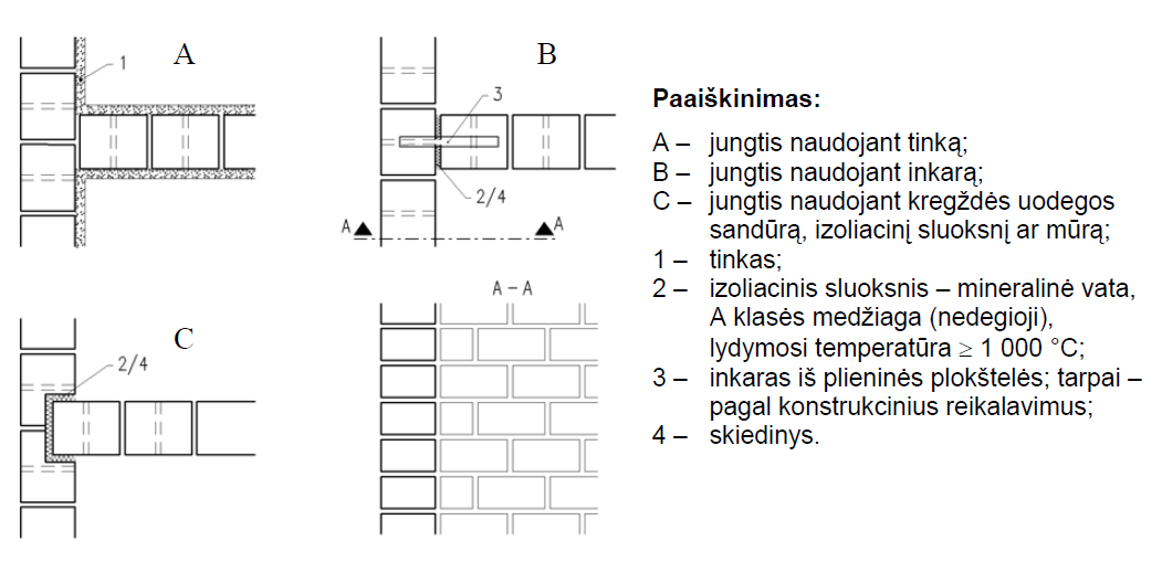 Papildomų mūro elementų (pvz.: sąramų), o taip pat mūrines konstrukcijas standinančių elementų (pvz.: skersinės sienos, perdangos, kolonos) atsparumas ugniai turi būti ne mažesnis nei sienos. Dėmesį taip pat būtina atkreipti į konstrukcijų sandūrų bei deformacinių siūlių įrengimą. Tokių sandūrų įrengimo pavyzdžiai pateikti paveiksluose nr.:4 – 6. Sandūros bei deformacinės siūlės privalo užtikrinti visai sienai keliamus atsparumo ugniai reikalavimus. Jeigu deformacinėms siūlėms naudojamas termoizoliacinis užpildas, tai šio užpildo lydymosi temperatūra turi būti ne žemesnė nei 1000°C. Sandūros ir deformacinės siūlės turi būti tinkamai užsandarintos, kad konstrukcijų deformacijos, viena kitos atžvilgius, nepakenktų sienos atsparumui ugniai.
